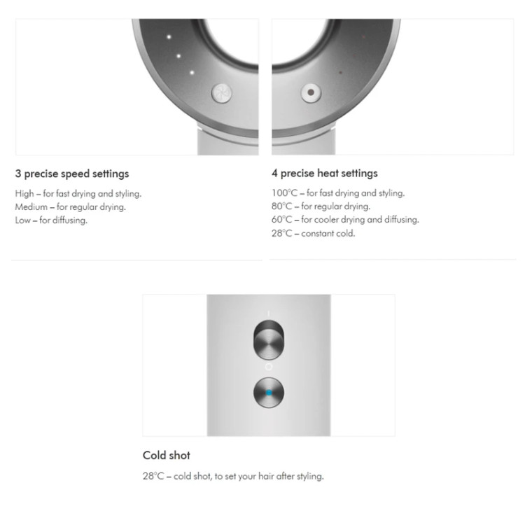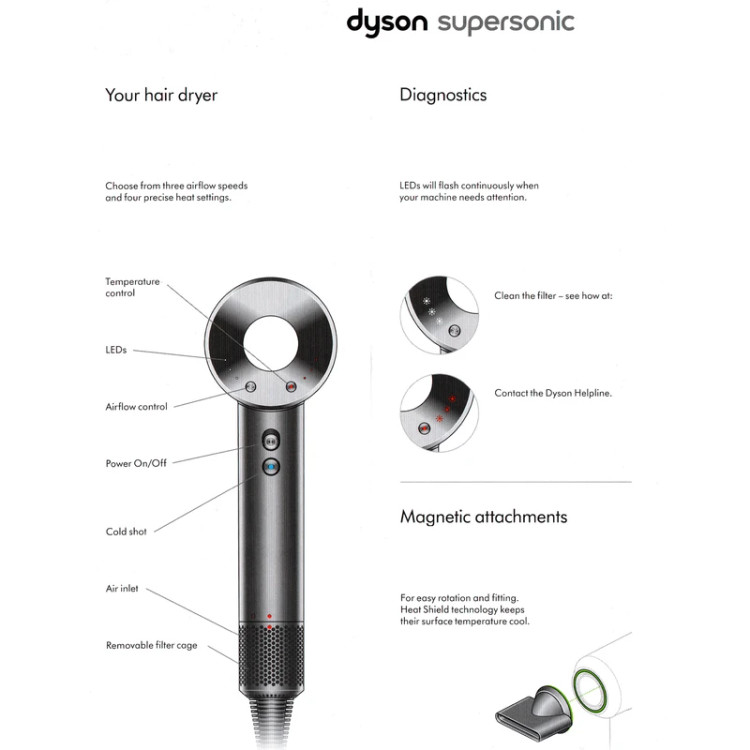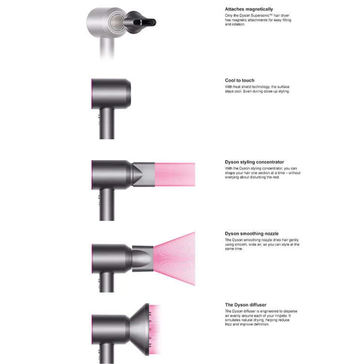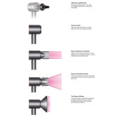 دارای اتصال مغناطیسی برای سری های مختلف / دکمه خاموش کننده المنت برای ایجاد باد سرد / سیستم ایجاد یون منفی برای حذف الکتریسیته ساکن مو / کابل برق ۲.۷ متری / میزان صدای تولیدی ۷۷ دسیبل / برنده جایزه Allure Best of Beauty Award ۲۰۲۳ / موتور digital motor V۹ کمپانی Dyson / سشوار Dyson Supersonic ™ برای محافظت از مو در برابر آسیب شدید حرارت طراحی شده است، با خشک کردن سریع و حالت های حرارتی کنترل شده، جهت کمک به افزایش نرمی مو تا ۷۵%، افزایش درخشندگی مو تا ۱۳۲% و کاهش وز شدن تا ۶۱%