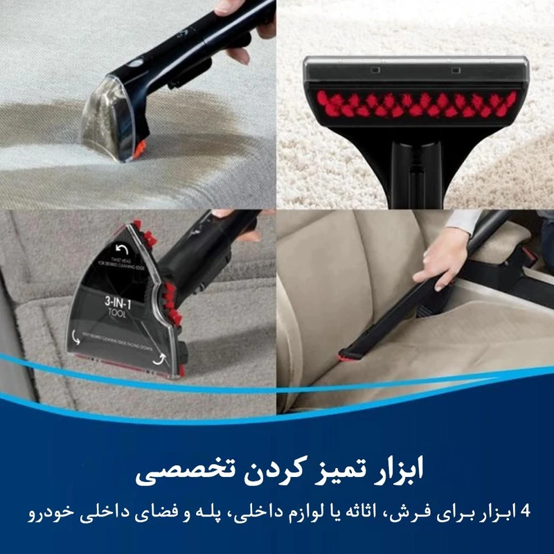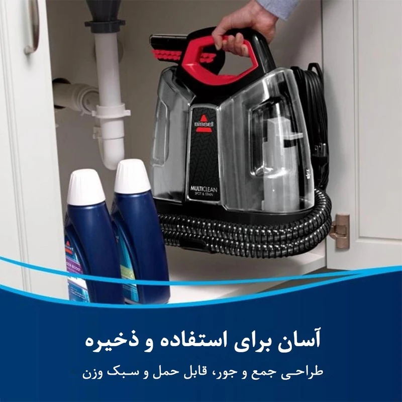 لکه های سخت را برای همیشه از بین می برد: فرمول BISSELL Spot & Stain + Oxygen Boost لکه های سخت را برای همیشه از بین می برد. به سرعت انواع آشفتگی های داخل و اطراف خانه را پاک می کند. سیستم دو مخزن: BISSELL MultiClean Spot & Stain Carpet Cleaner شامل یک مخزن آب قابل جابجایی برای پر کردن و تخلیه آسان است. سیستم دو مخزن اجازه می دهد تا با آب تمیز، تمیز شود در حالی که کثیفی و در مخزن دیگری ذخیره می شود.فناوری موج گرما: به حفظ دمای ثابت آب در حین تمیز کردن کمک می کند. این بهترین سیستم تمیز کننده ما برای سخت ترین لکه ها و بوها است – حتی بوی بد را از بین می برد. پس از اتمام تمیز کردن، مخزن آب کثیف به راحتی تخلیه می شود. چندین سطح را تمیز می کند: پاک کننده لکه های BISSELL دارای ۴ ابزار تخصصی است و به سرعت آلودگی های روی فرش، موکت، اثاثه یا لوازم داخلی، پله ها و فضای داخلی خودرو را پاک می کند. همچنین می توان از آن بر روی سطوح نرم مانند کاناپه، مبل، تشک و غیره استفاده کرد. استفاده آسان: طراحی جمع و جور آن نگهداری آن را در مکان های مناسب مانند کمد یا حتی زیر سینک آسان می کند. قابل حمل و سبک است. دارای شیلنگی به طول ۲.۲ متر برای تمیز کردن بیشتر مناطق مختلف خانه و ماشین شما. دارای دو مخزن : حجم مخزن آب ۱/۱ لیتر، حجم مخزن بازیابی ۱/۴ لیتر ، طول شیلنگ ۲/۲ متر ،سطح صدا ۷۴ دسی بل .فرمول BISSELL Spot & Stain + Oxygen Boost این دستگاه لکه ها و انواع لکه های سخت را برای همیشه از بین می برد. به سرعت انواع آلودگی های داخل و اطراف خانه را پاک می کند. BISSELL MultiClean Spot & Stain Carpet Cleaner شامل مخزن آب قابل جابجایی برای پر کردن و تخلیه آسان است. سیستم دو مخزن اجازه می دهد تا با آب تمیز تمیز شود در حالی که کثیفی و کثیفی در مخزن دیگری ذخیره می شود. به حفظ دمای ثابت آب در حین تمیز کردن کمک می کند. این بهترین سیستم تمیز کننده ما برای سخت ترین لکه ها و بوها است - حتی بوی بد را از بین می برد .