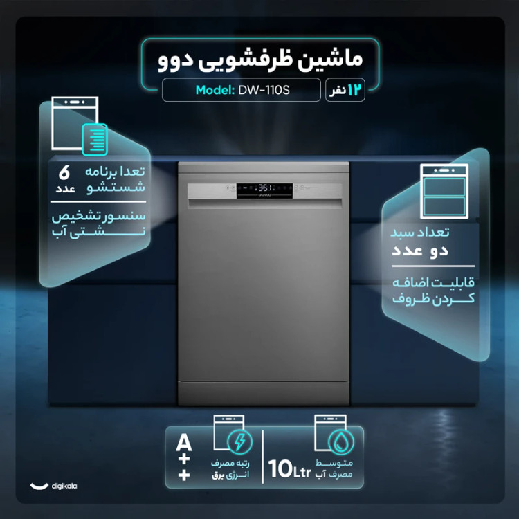 سایر ویژگی ها: قابلیت تنظیم زمان شروع شستوشو از ۱ تا ۱۲ ساعت / امکان افزودن ظروف در بین فرایند شستوشو / سیستم عیبیابی خودکار / صفحه نمایش LED / دارای سبد قاشق و چنگال مجزا